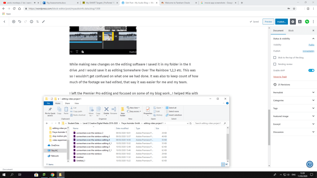 While making new changes on the editing software I saved it in my folder in the X drive ,and I would save it as editing Somewhere Over The Rainbow 1,2,3 etc. This was so I wouldn’t get confused on what one we had done. It was also to keep count of how much of the footage we had edited, that way it was easier for me and my team.